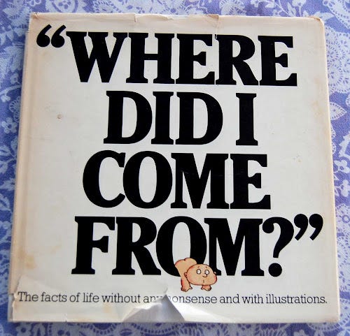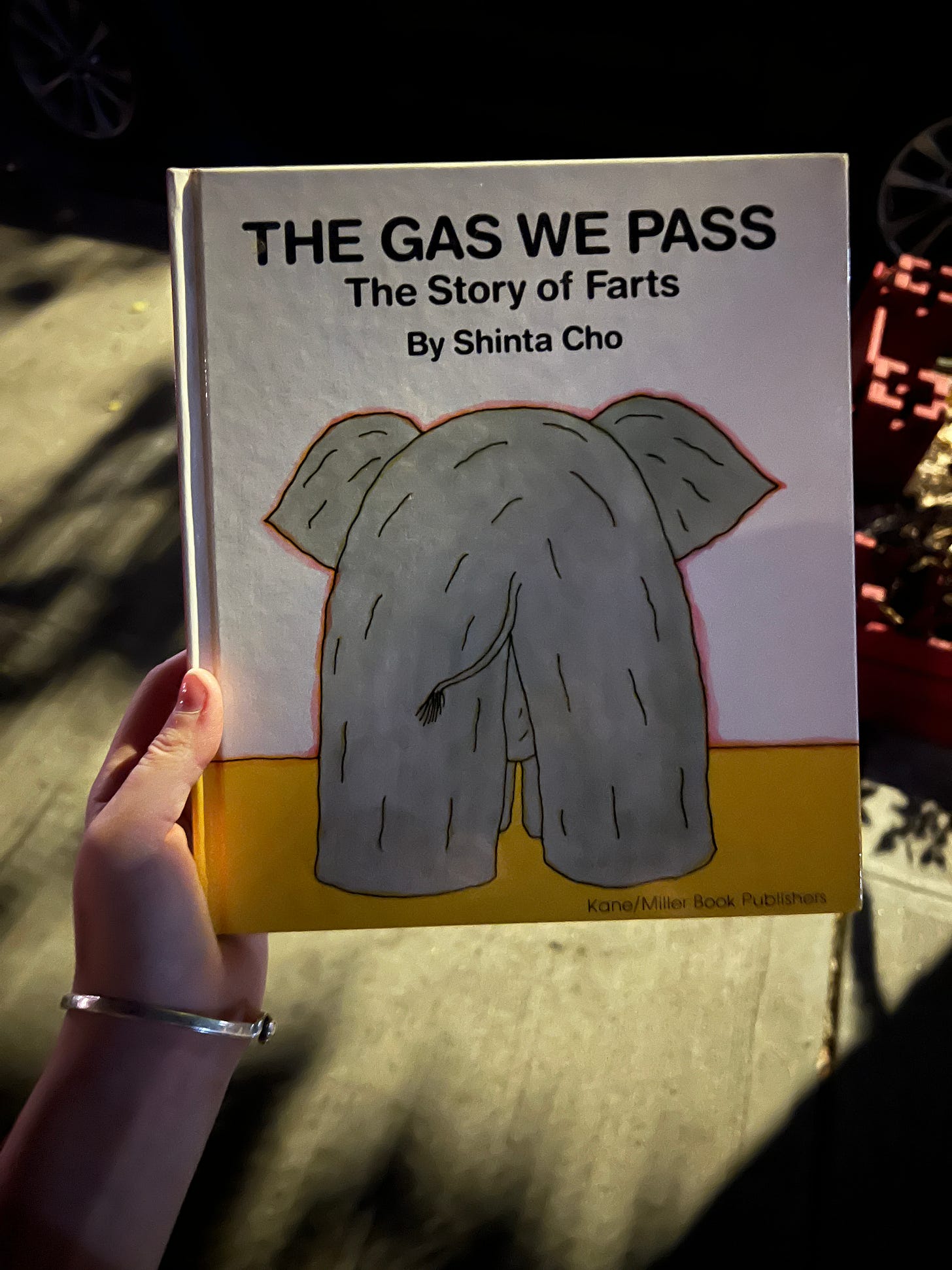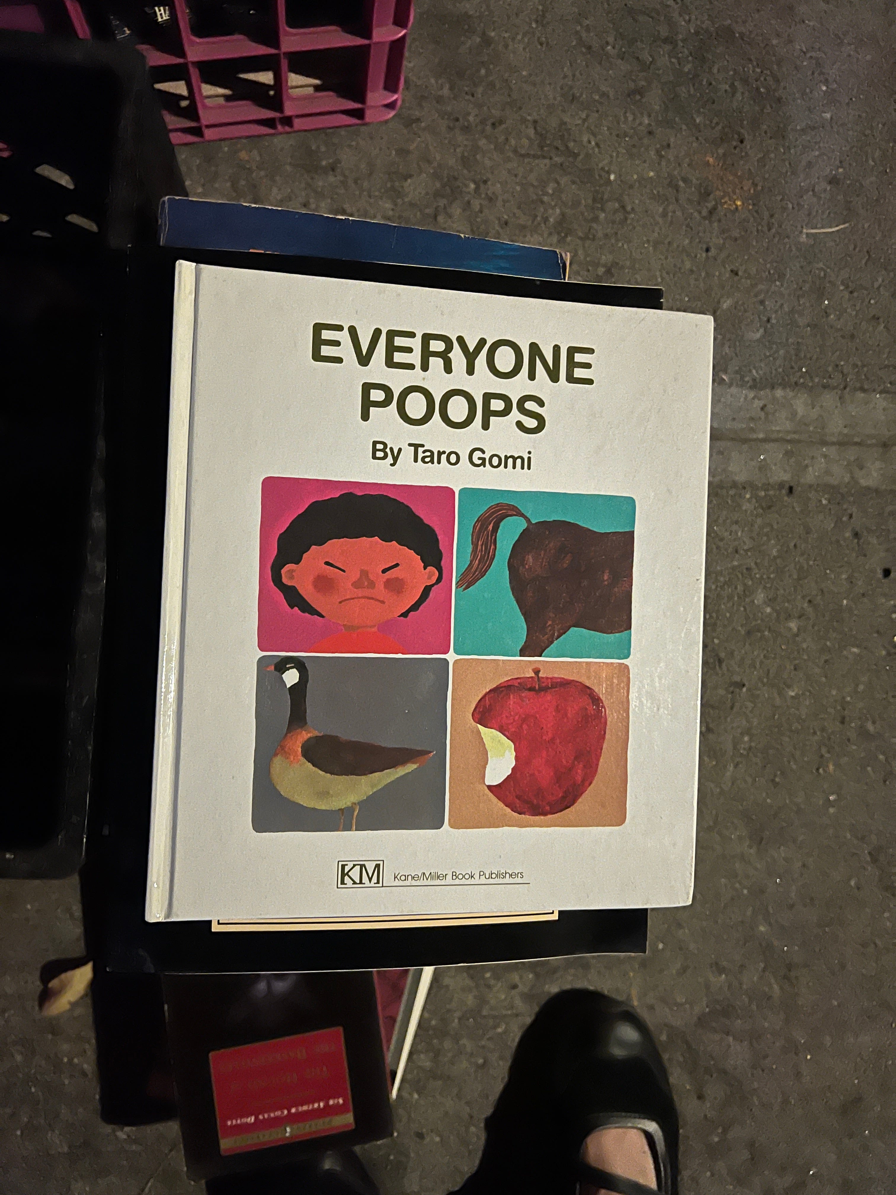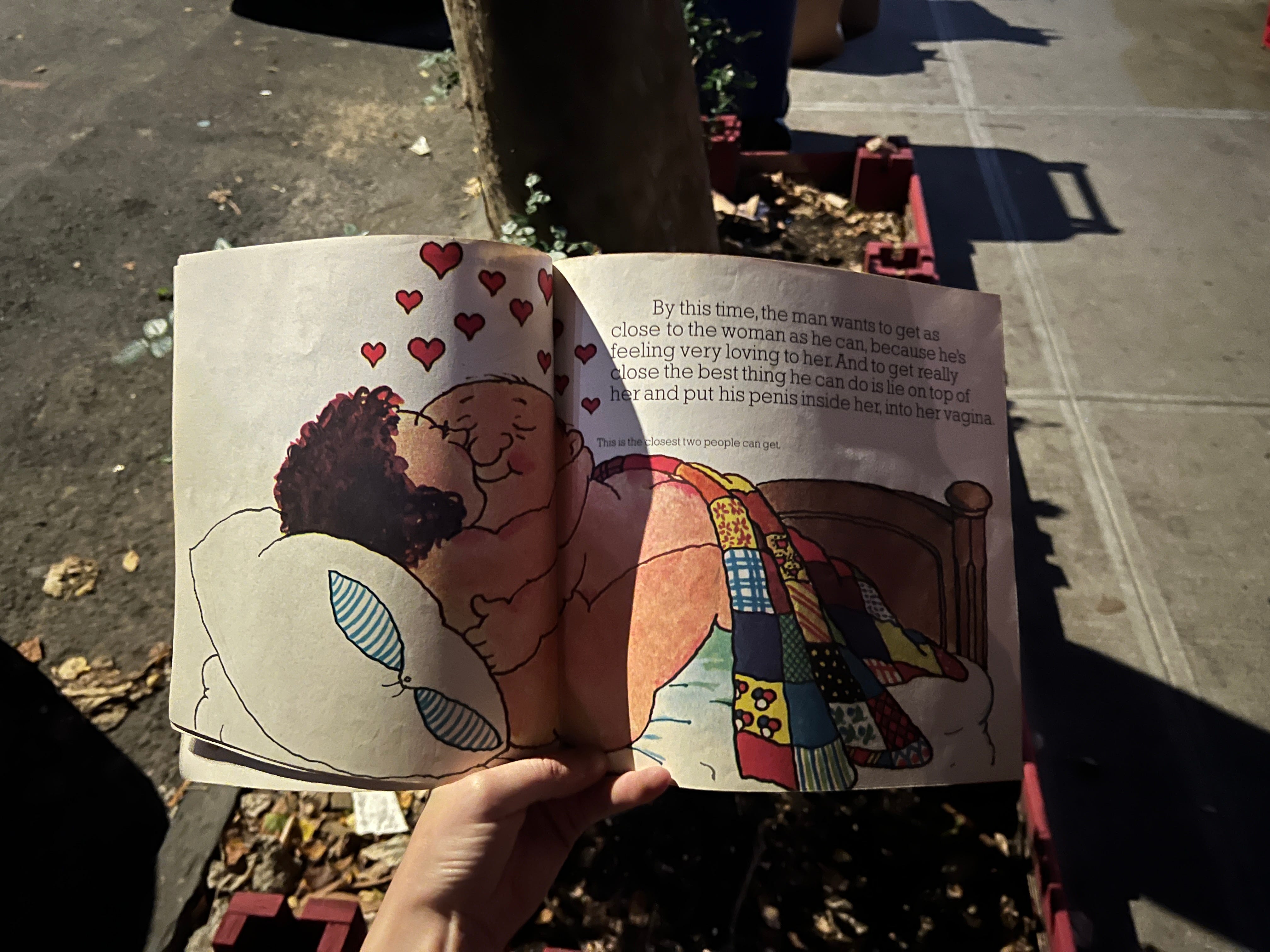 Back over the bridge, where the full moon glows behind a shade of clouds and the Kosciuszko is bright orange in the distance, I wander back to Greenpoint. I cut down a side street and find someone has curbed four milk crates full of books. I spy a mix of American Lit classics, paperback beach reads, books on travel and books for kids, books in Polish; a family kind of collection. I kneel down to go through them. There are some children’s books worth noting, including a very detailed 1970s paperback about where babies come from.